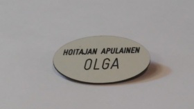 Valkoinen pohja, musta teksti. Koko 55x30mm. Takana hakaneula kiinnitykseen.