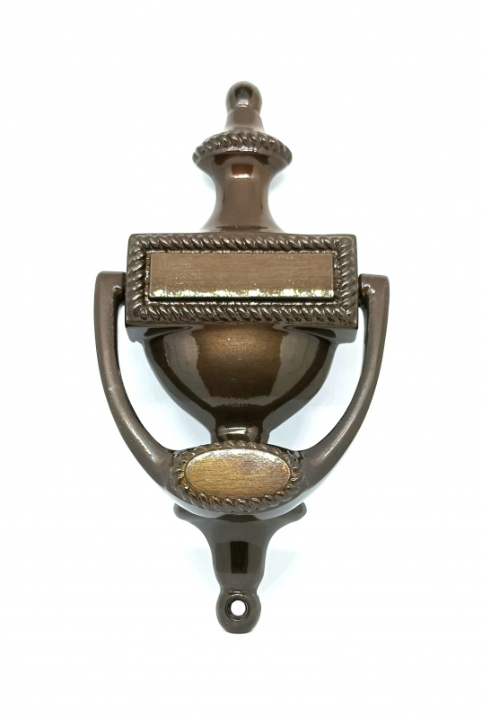 Tummanruskea messinkinen muotoon valettu kolkutin.