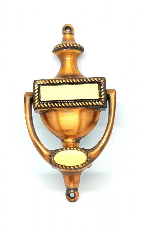 Kuparin värinen messinkinen muotoon valettu kolkutin.