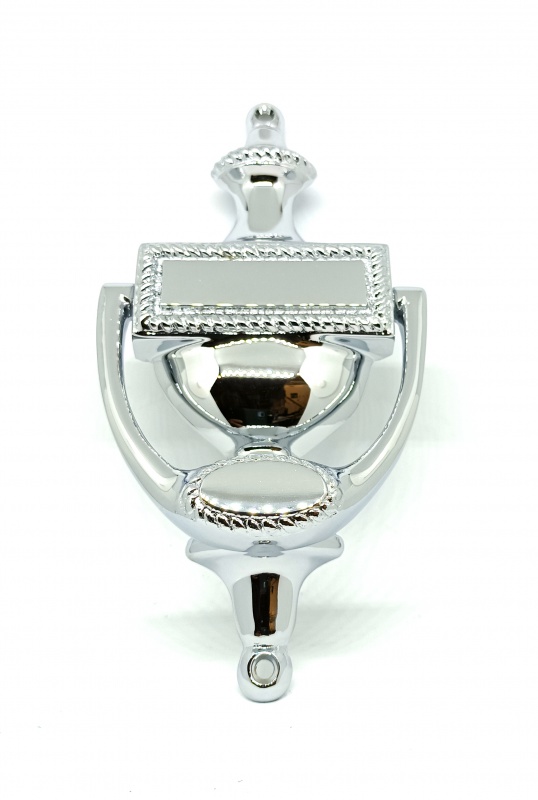 Kromin värinen kiiltävä messinkinen muotoon valettu kolkutin.