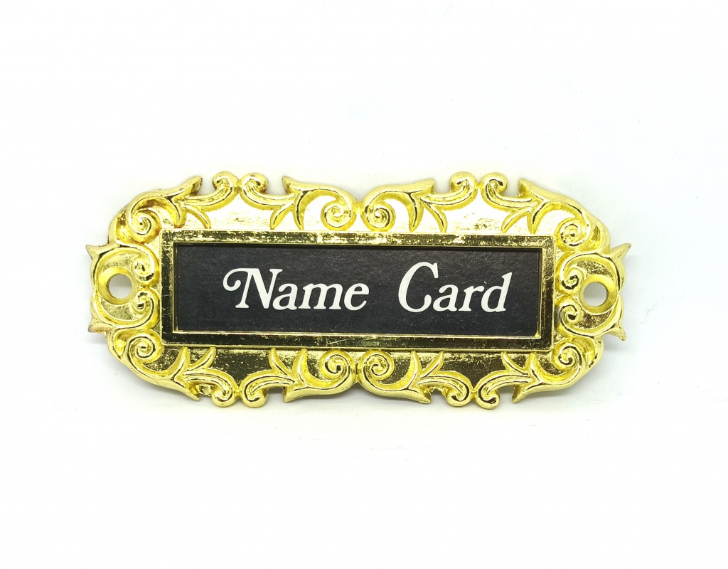 Ovikilpi jossa kullan värinen kehys, nimiosa kaiverrusmuovia.