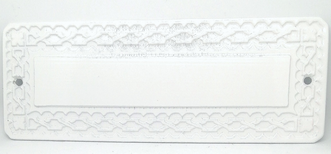 Kiiltävä valkoinen, teksti tummaksi hapotettu.