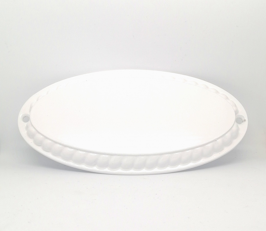 Kiiltävä valkoinen, teksti messinki tai tummaksi hapotettu.