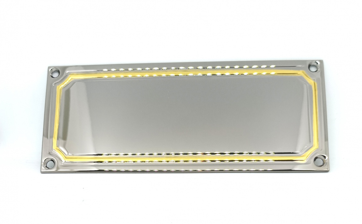 Ovikilpi kiiltävä hopean värinen messinkisellä kehyksellä.