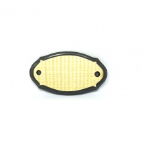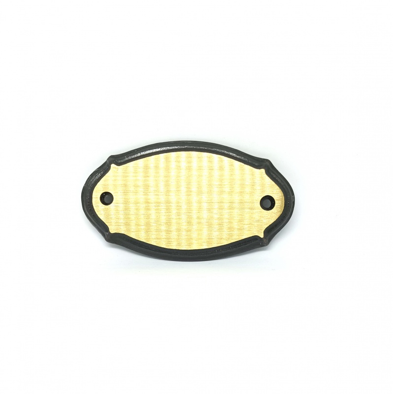 Messinkinen ovikilpi mustalla reunuksella. Koko 87x49mm.