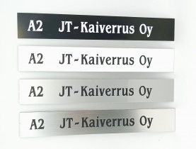 Värit: Musta pohja valkoinen teksti, valkoinen, harmaa, tai hopea mustalla tekstillä.